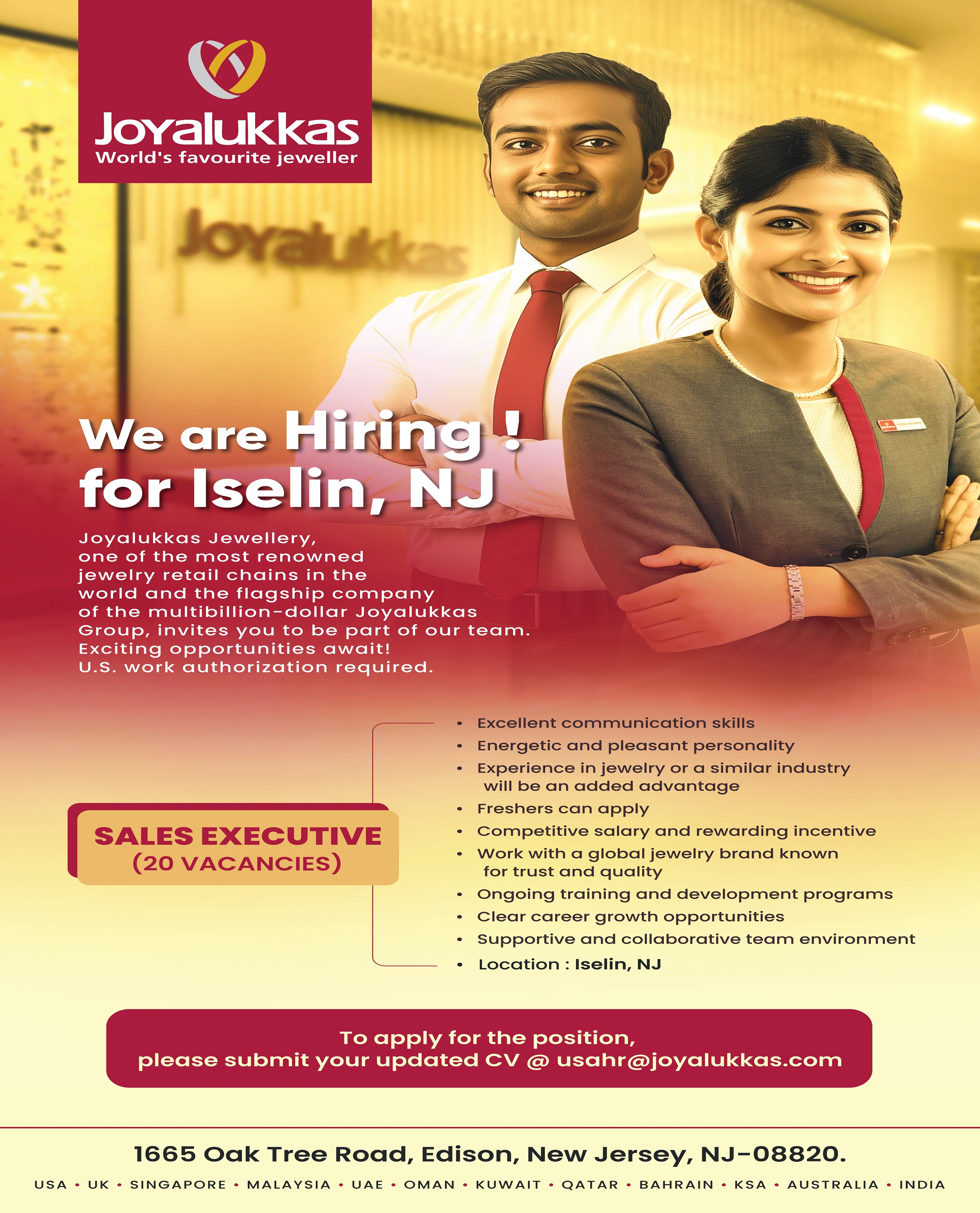 This is a full-time on-site role for a Sales Executive in Iselin, NJ. The Sales Executive will be responsible for day-to-day tasks related to sales in the Store, providing customer service support, coordinating with customers, completing monthly sale targets, and ensuring a seamless customer experience in the Store.